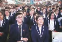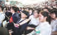“毕业宣誓”将毕业典礼推向高潮。在激昂的音乐声中,同学们逐个从郭惠宇校长手中接过毕业纪念卡,经过毕业门走出会场。毕业门两旁,是手持鲜花的教师,他们目送学生离去。许多学生依依不舍地与教师握手、拥抱,表达这份深深的师生情。